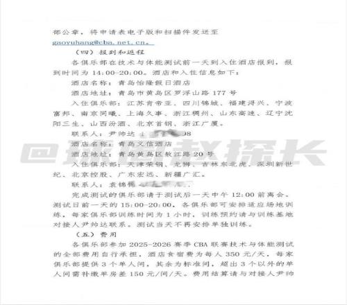 据探长了解,中国篮协已向CBA各俱乐部下发新赛季体测通知。