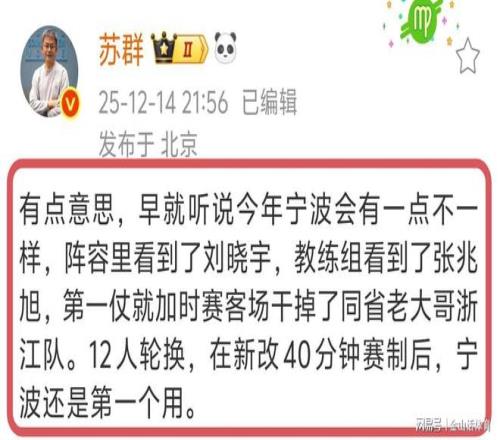 “平民球队”击败CBA老牌劲旅,赛后著名篮球记者苏群,在个人媒体平台写道“有点意思,早就听说今年宁波会有一点不一样,阵容里看到了刘晓宇,教练组看到了张兆旭,第一仗就加时赛客场干掉了同省老大哥浙江队。12人轮换,在新改40分钟赛制后,宁波还是第一个用。 ”。