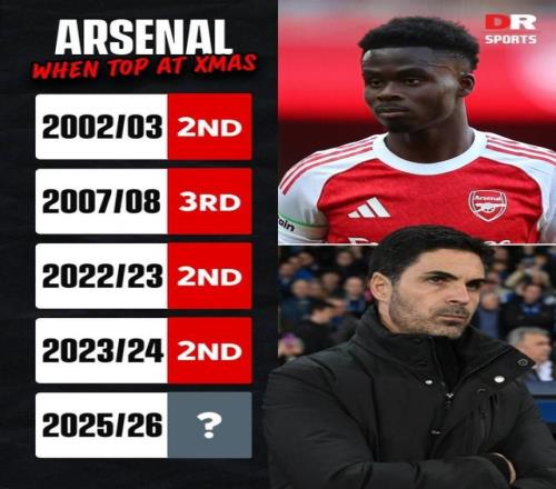阿森纳1比0小胜阿尔特塔老东家埃弗顿,继续领先曼城2分领跑英超积分榜。这是阿森纳第5次以圣诞冠军身份领跑,然而前4次都没能最终夺冠(2002-03亚军、2007-08季军、2022-23亚军、2023-24亚军),其中前2次是被曼联逆转夺冠,后2次是被曼城逆转夺冠。 若算上老英甲时代,枪手还有3次成为圣诞冠军却没能最终捧起奖杯,分别是1951-52季军、1986-87殿军、1989-90殿军。