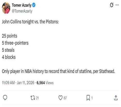 凭借这样的表现,科林斯成为NBA历史上首位单场至少拿下25分、5记三分、4次抢断、4次盖帽的球员。